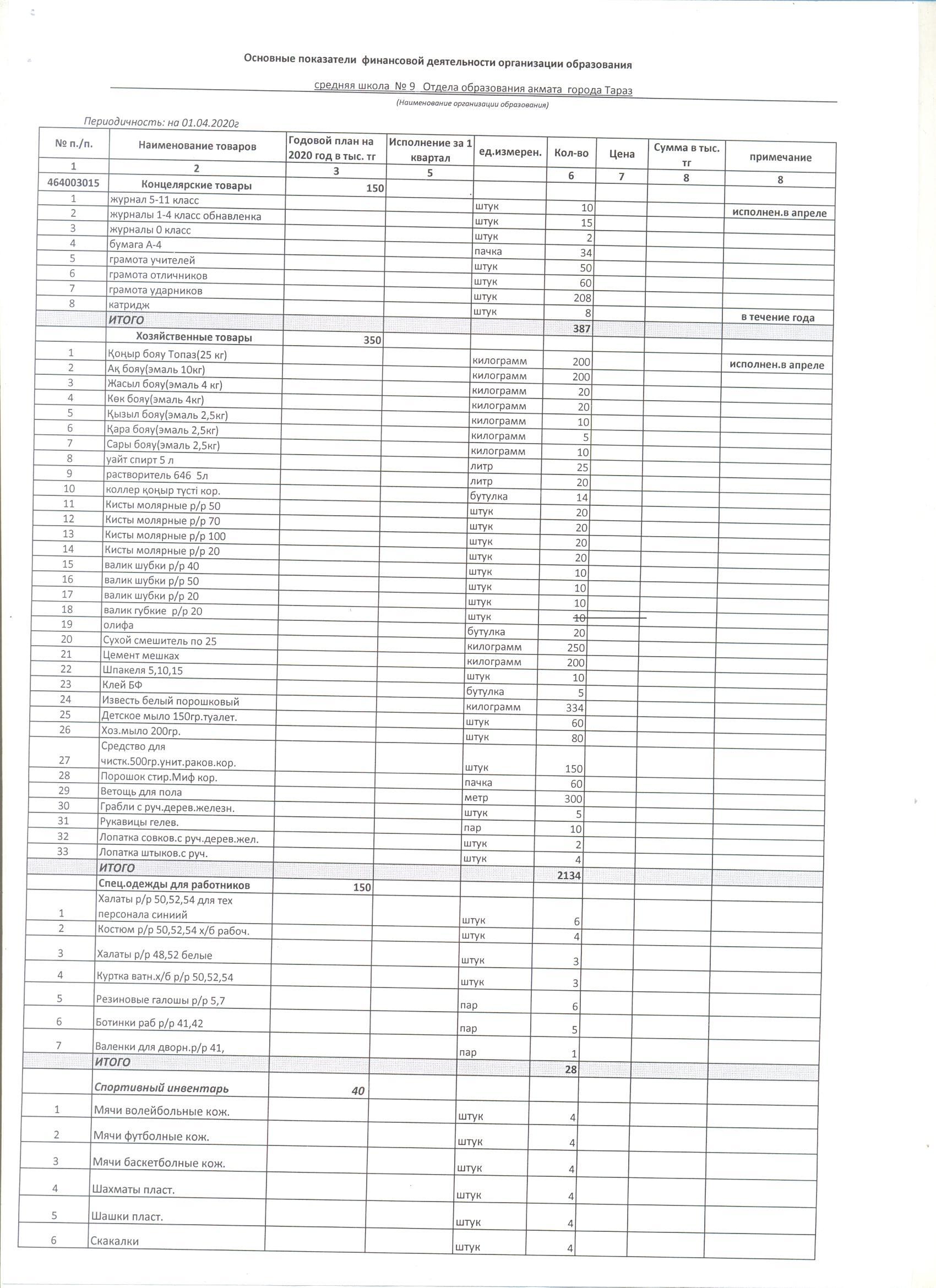 01 сәуір 2020 0 1 2 3 4 5 основные показатели финансовой деятельности организации образования по состоянию на 01.04.2020 г.