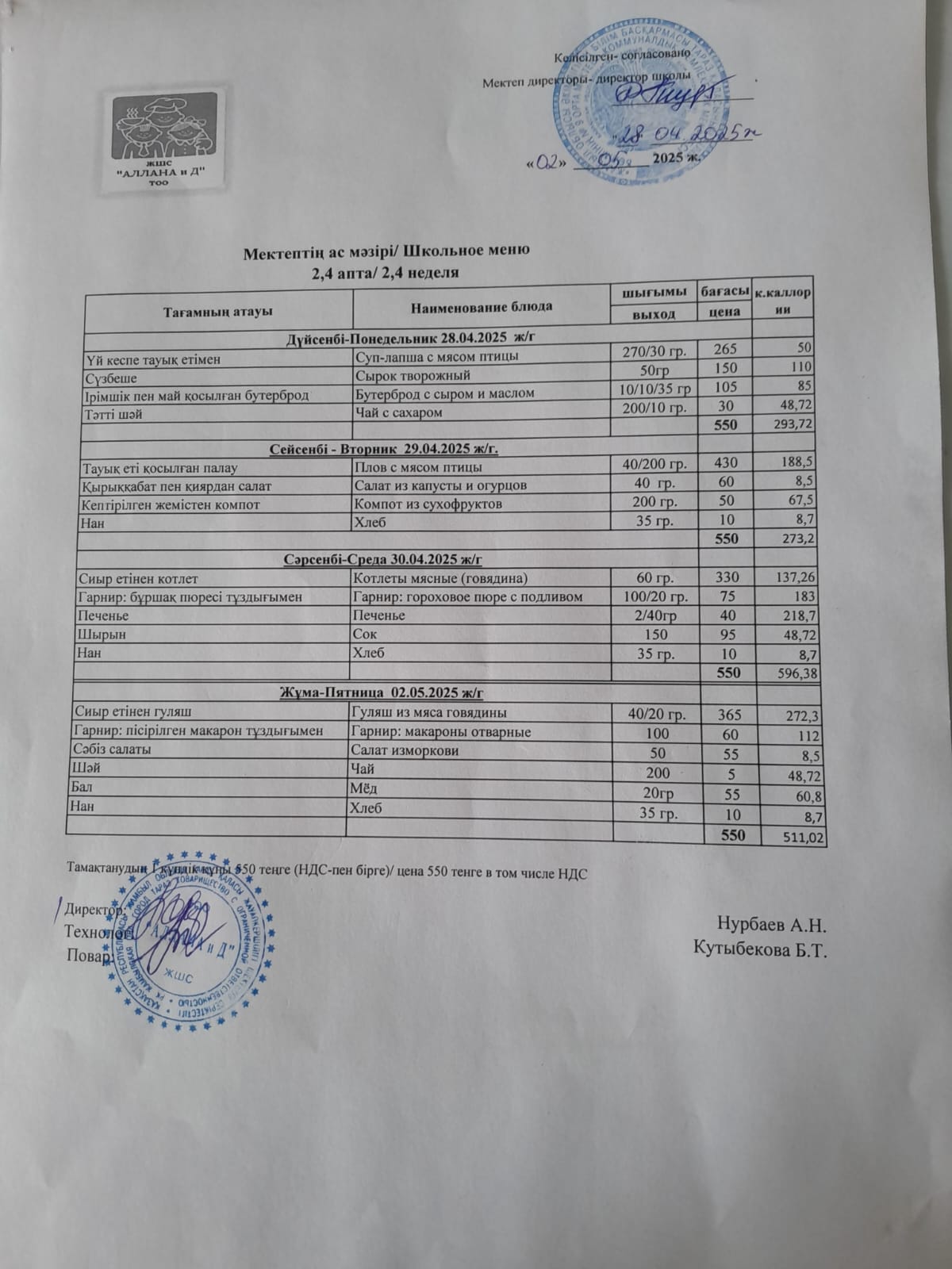 Апталық ас мәзірі » № 9 орта мектеп