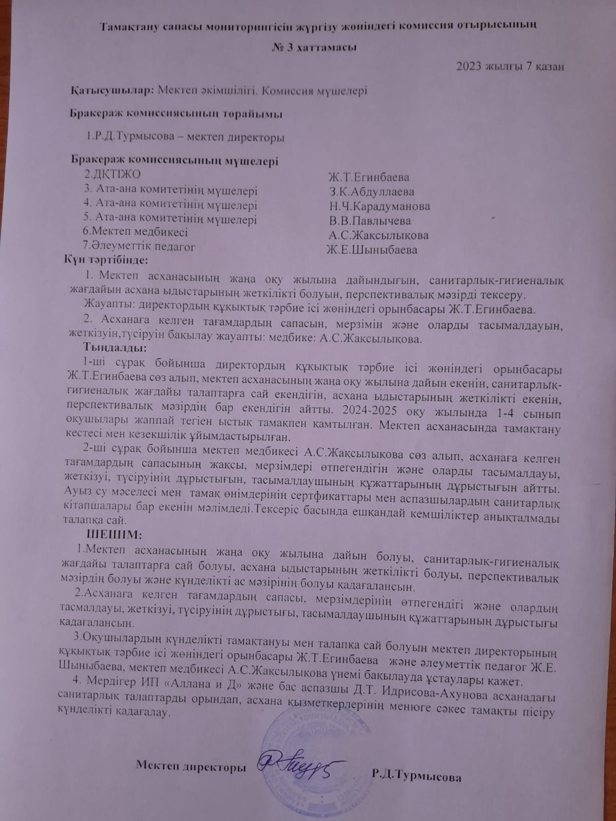 07 қазан 2024 0 1 2 3 4 5 Тмақтану сапасы мониторингісін жүргізу жөніндегі комиссия отырысының №3 хаттамасы