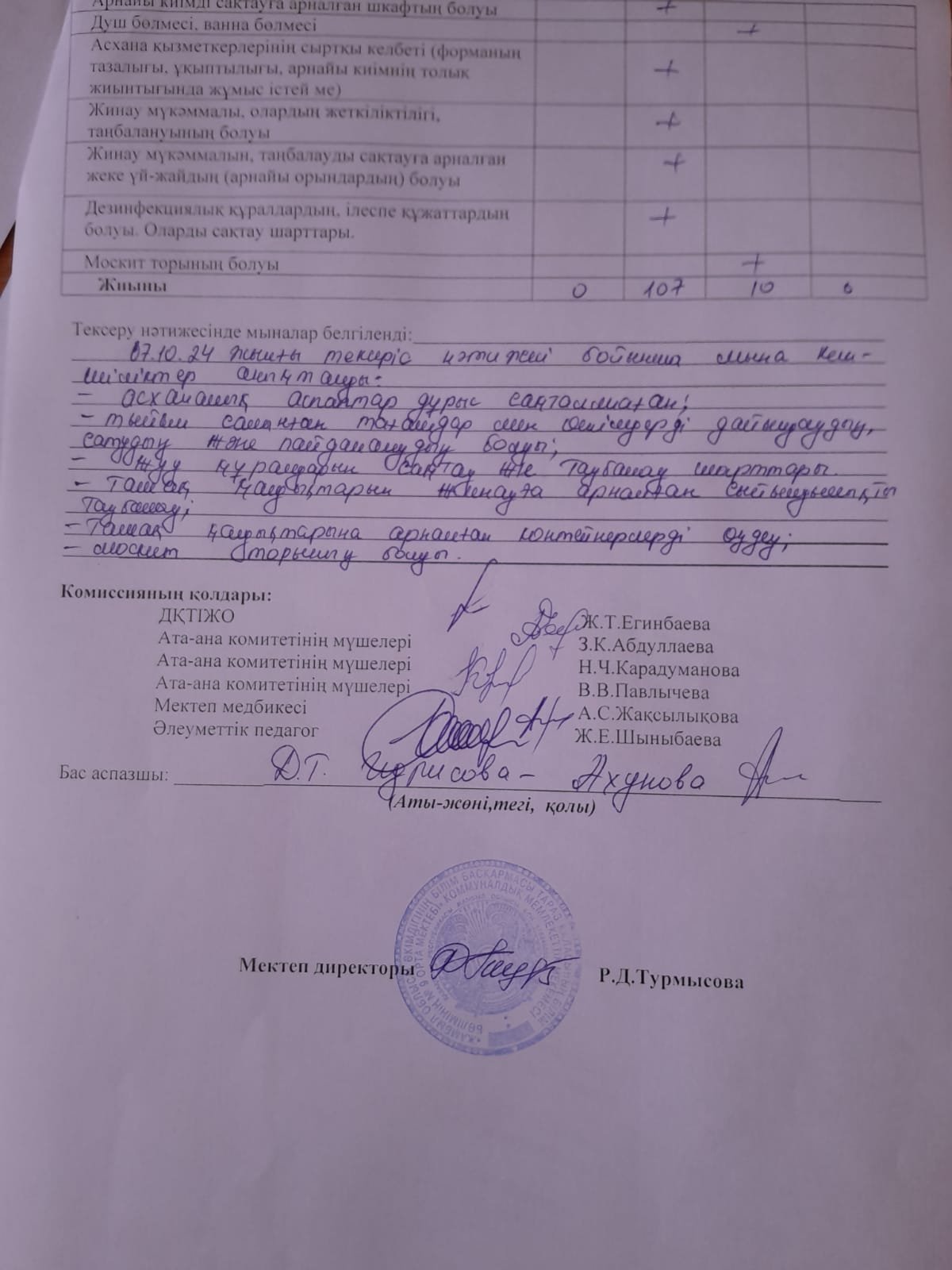 07 қазан 2024 0 1 2 3 4 5 Тамақтану сапасын бақылау бойынша бракераж комиссия тобының тексеру жұмыстарының актісі