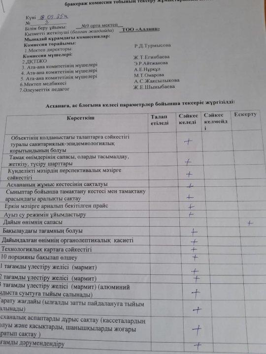 18 қыркүйек 2025 0 1 2 3 4 5 Тамақтану сапасын бақылау бойынша брокераж комиссия тобының тексеру жұмыстарының актісі