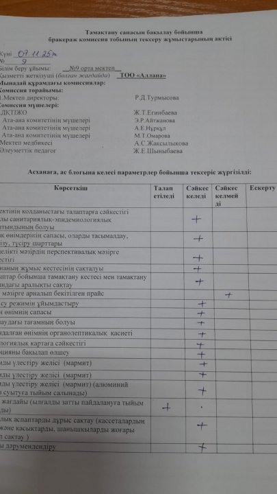 Тамақтану сапасын бақылау бойынша бракераж комисия тобының тексеру жұмысы » № 9 орта мектеп
