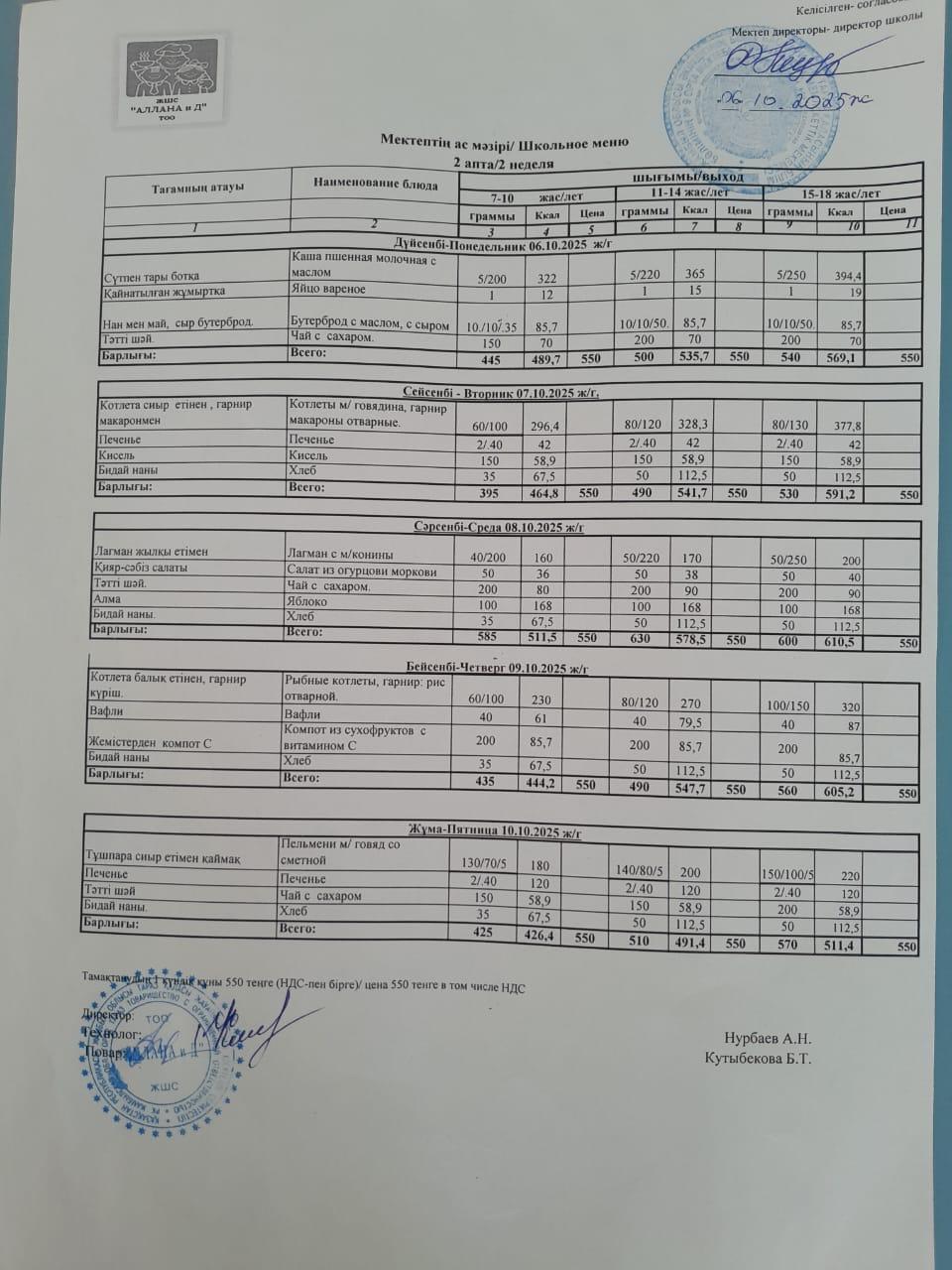 09 сентябрь 2024 Апталық ас мәзірі