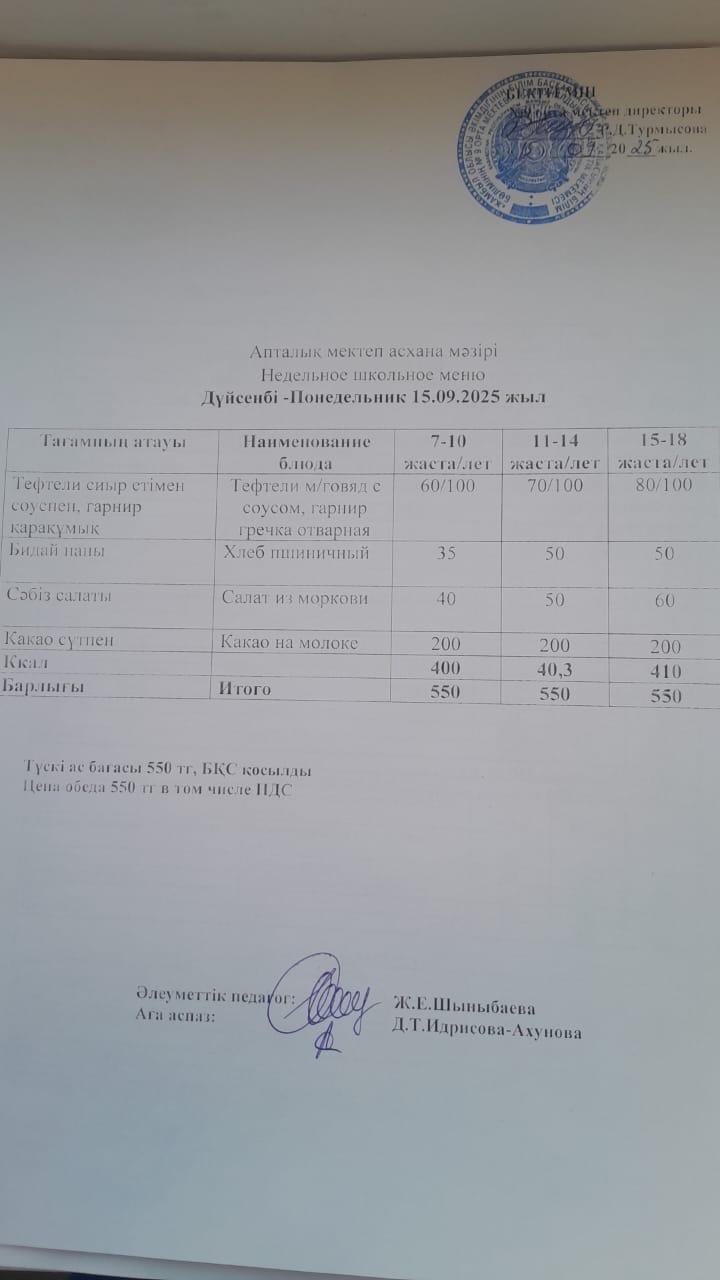 Меню по питанию » № 9 орта мектеп