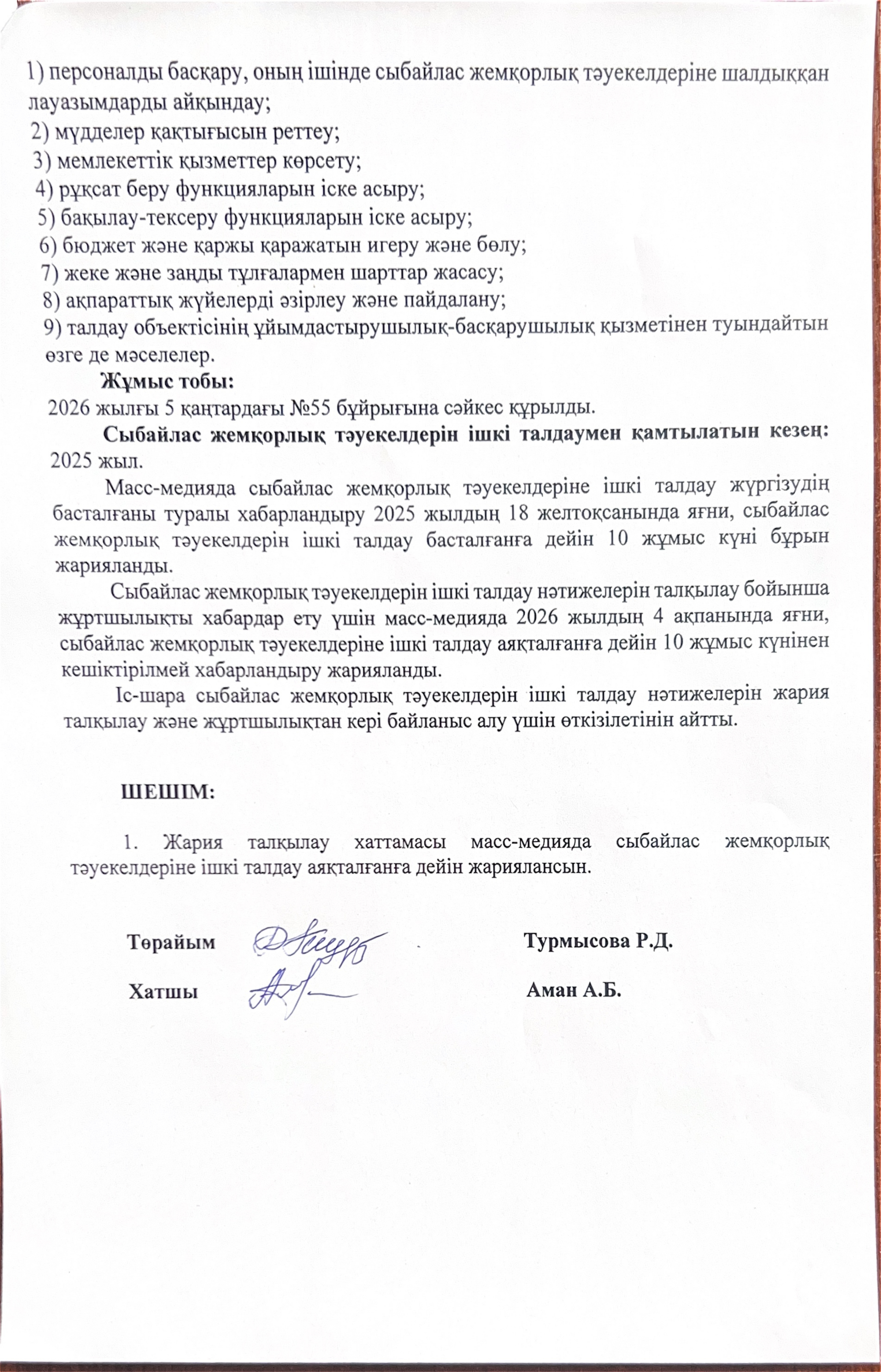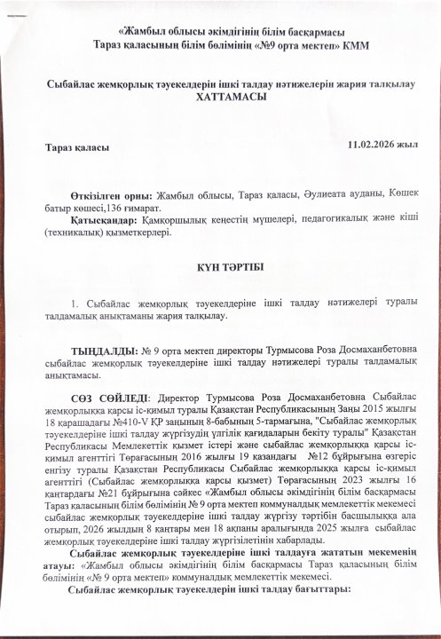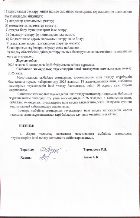 11 ақпан 2026 0 1 2 3 4 5 Сыбайлас жемқорлық тәуекелдерін ішкі талдау нәтижелерін жария талқылау ХАТТАМАСЫ