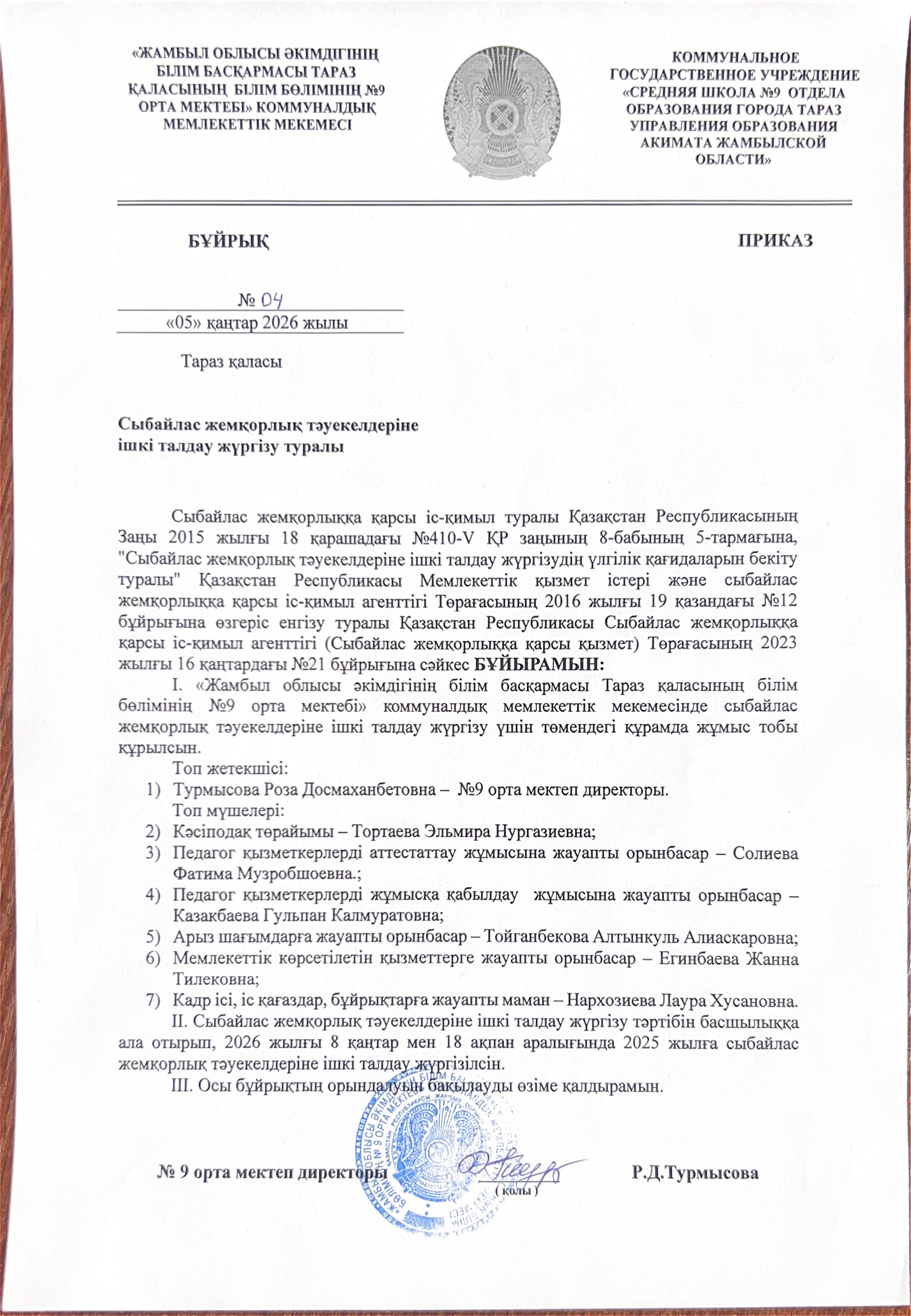 Сыбайлас жемқорлық тәуекелдеріне ішкі талдау жүргізу туралы бұйрық » № 9 орта мектеп